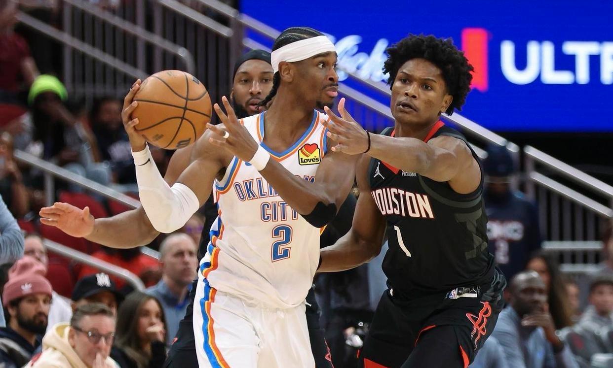 NBA常规赛,火箭坐镇主场迎击雷霆。本场比赛之前,火箭23胜14负排名西部第6,过去4场比赛他们输掉3场,被开拓者双杀,惨败倒数第一的国王,从阵容上看,火箭真的很强,全员天赋都是顶级,联盟平均身高最高的一支球队,去年夏天还引进了超级巨星杜兰特。然而,一番比赛下来却发现,光有天赋还是不行,火箭现在的投射有点糟糕,连着几场三分命中率都只有两成,再加上缺少控卫组织,他们暂时很难上升到争冠高度。另一边的雷霆队,34胜7负排名西部第一,近期雷霆又轰出4连胜,他们依然是现在最有统治力的一支队伍。